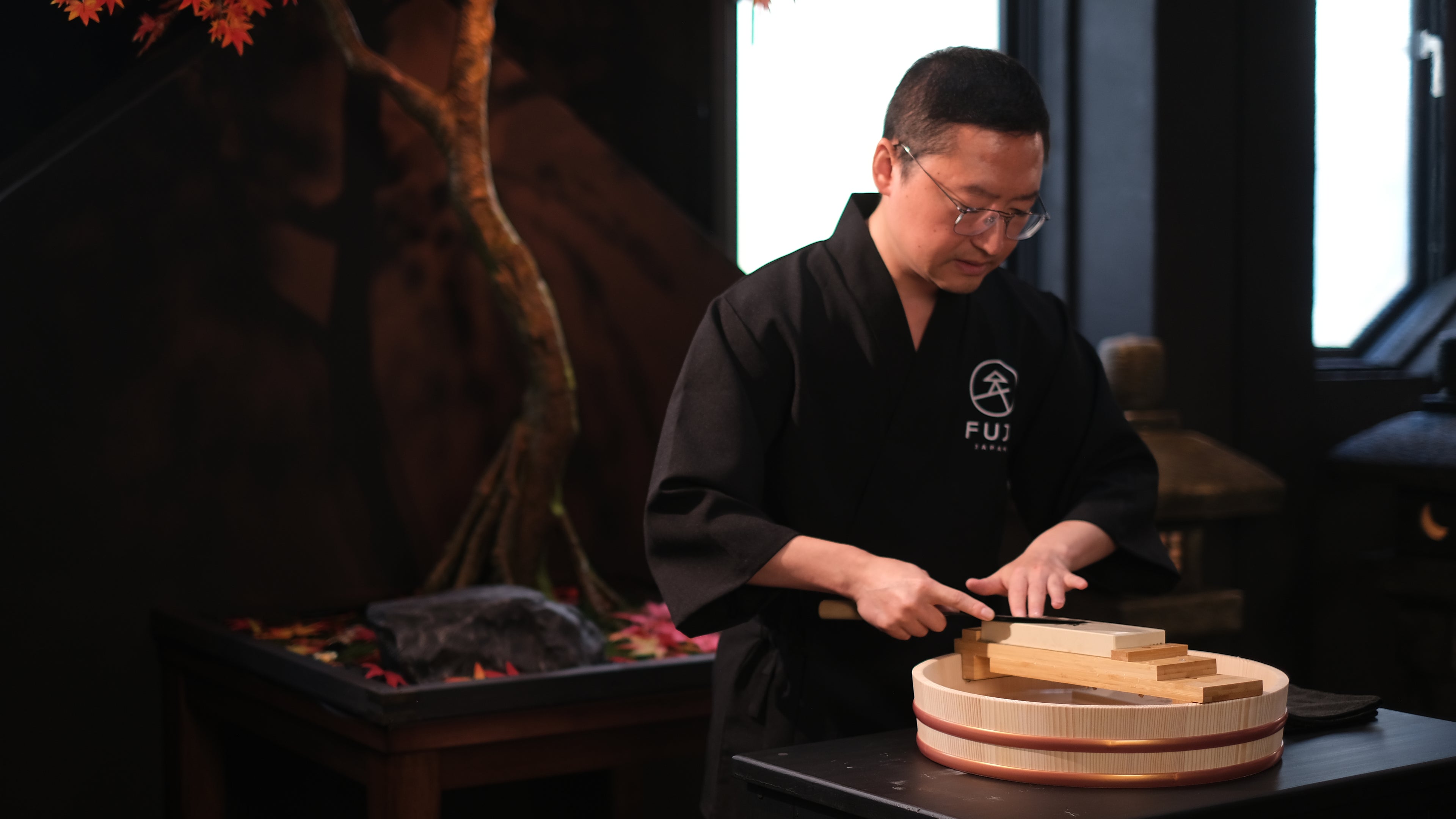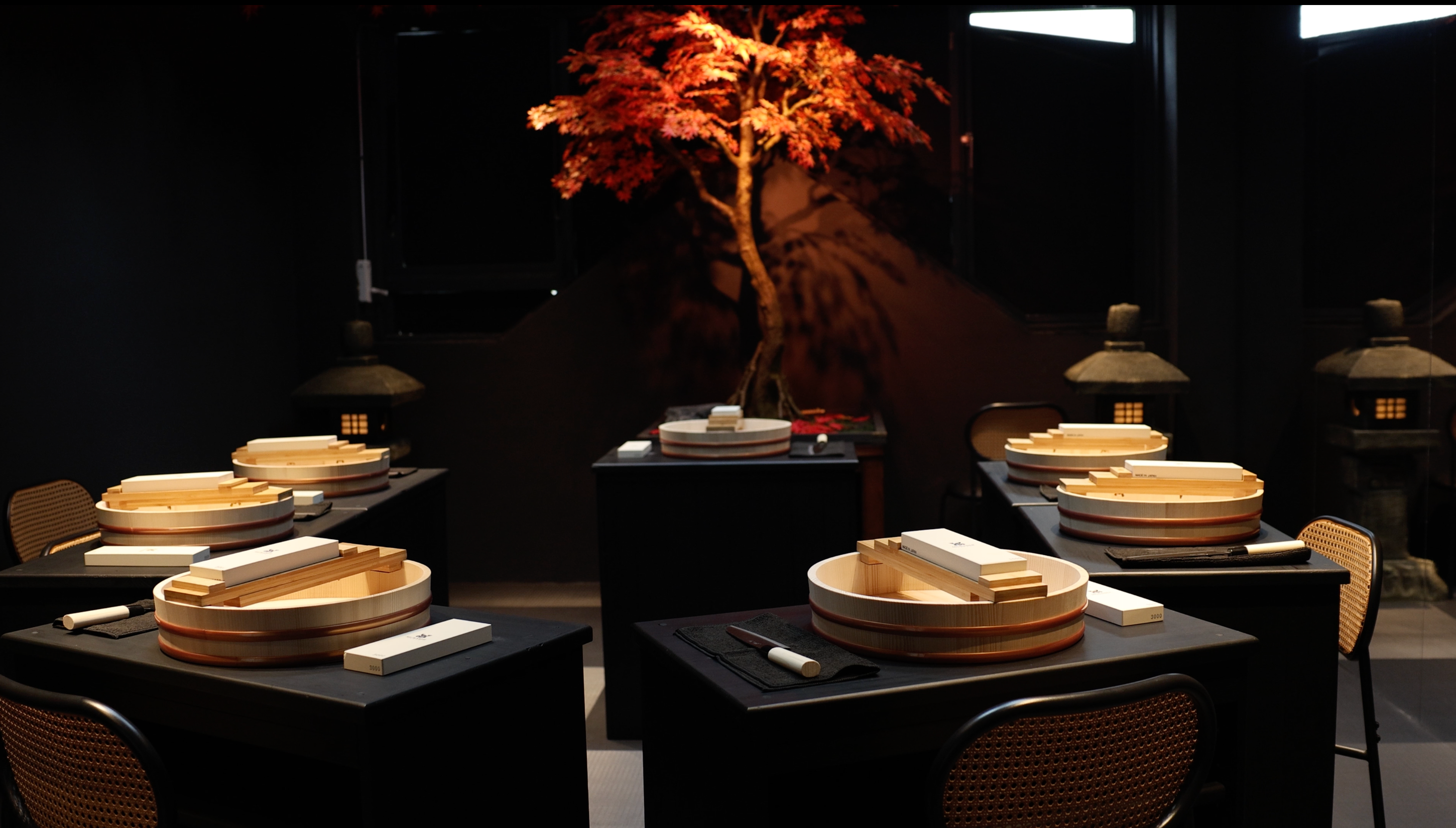 Refine your focus through the meditative act of knife sharpening, guided in a peaceful private room designed for immersive learning.